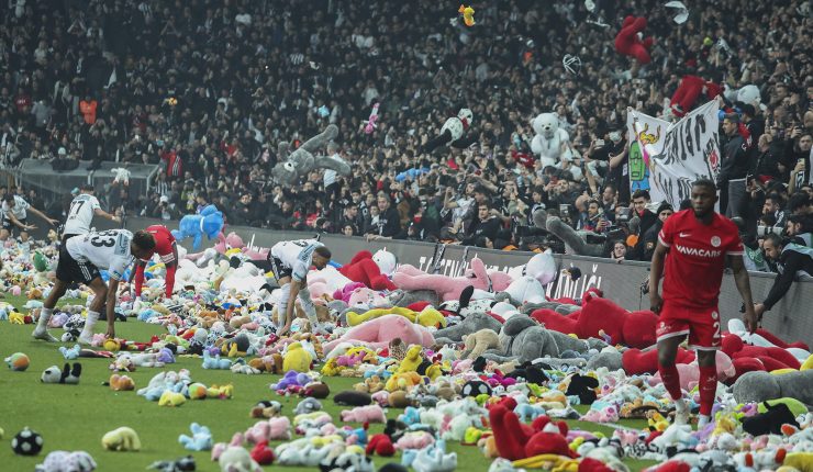 🇹🇷 ⚽️🧒Aficionados lanzan juguetes y peluches al césped durante un partido de futbol en Estambul para que sean donados a los niños sobrevivientes del reciente terremoto.