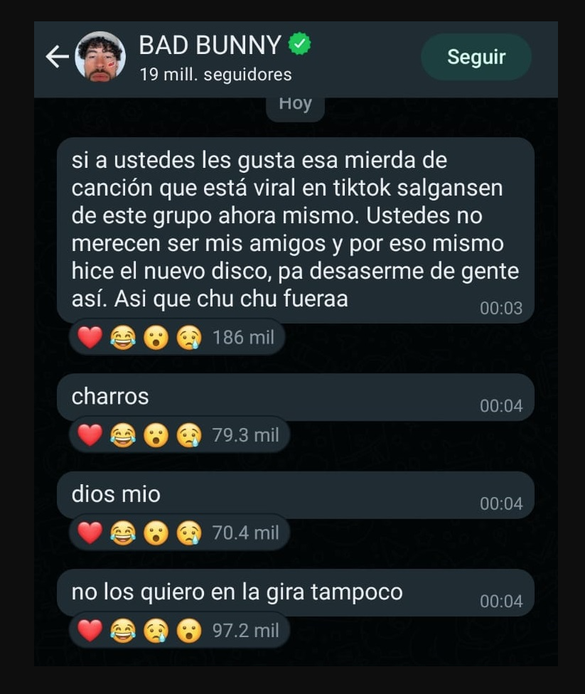 “Si a ustedes les gusta esa mie*** que está viral en Tik Tok salgansen del grupo ahora mismo. No merecen ser mis amigos y por eso mismo hice el nuevo disco, pa desaserme de. Así que chu chu fueraa”(sic).Cerró de una manera muy tajante: “No los quiero en mi gira tampoco”.