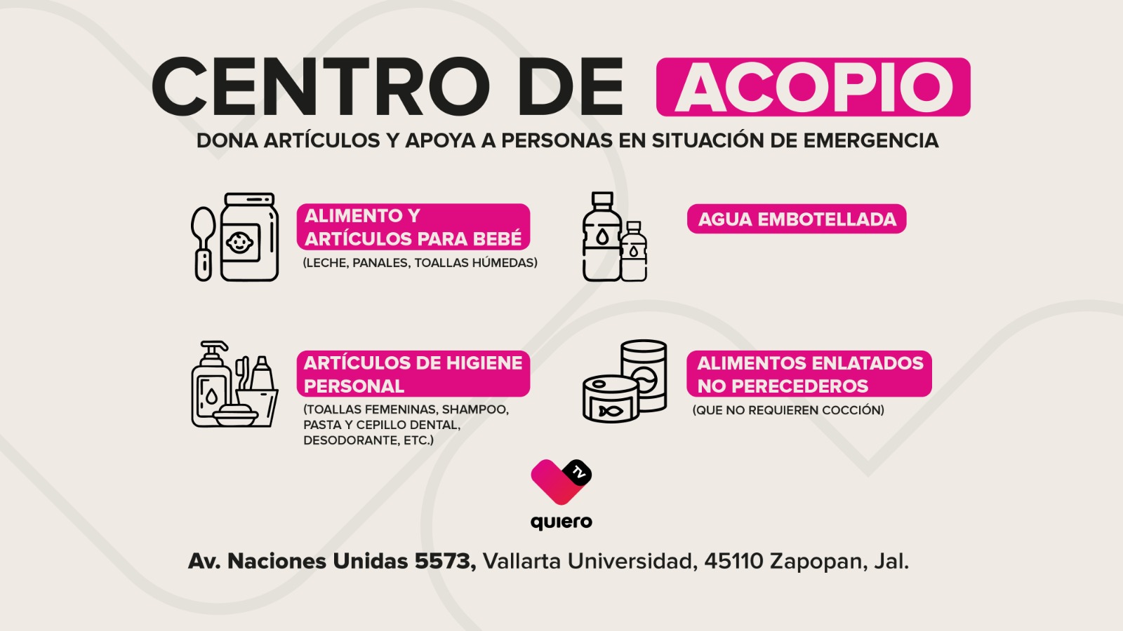 Para apoyar a la población de Tototlán, quiero tv instaló un centro de acopio en Naciones Unidas 5573, Col. Vallarta Universidad, Zapopan, con horario de lunes a viernes de 8:00 a 18:00 horas y sábados de 8:00 a 13:00 horas. Se reciben alimentos y artículos para bebé (leche, pañales, toallas húmedas), agua embotellada, productos de higiene personal y alimentos enlatados no perecederos.