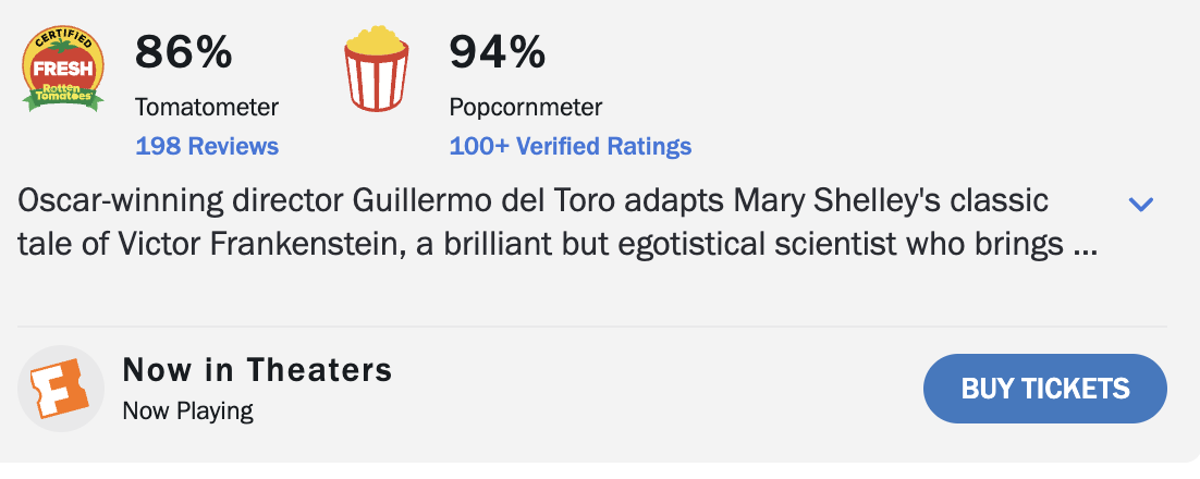 Esto luego de que, la cinta basada en la novela de Mary Shelley, del cineasta mexicano ganador del Óscar, registra por el momento un 86% de aprobación en el Tomatómetro, basado en 195 reseñas.