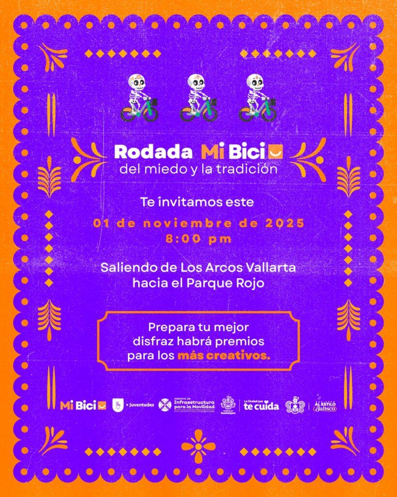 Las y los asistentes podrán realizar el recorrido con su propia bicicleta, sin embargo, si no cuentas con alguna, estarán disponibles 30 bicicletas para préstamo si acudes disfrazado. Aquellas personas que estén interesadas en hacerse beneficiario de dicho préstamo, se podrán registrar en el siguiente enlace: https://gobjal.mx/RodadaNocturnaMiBici;