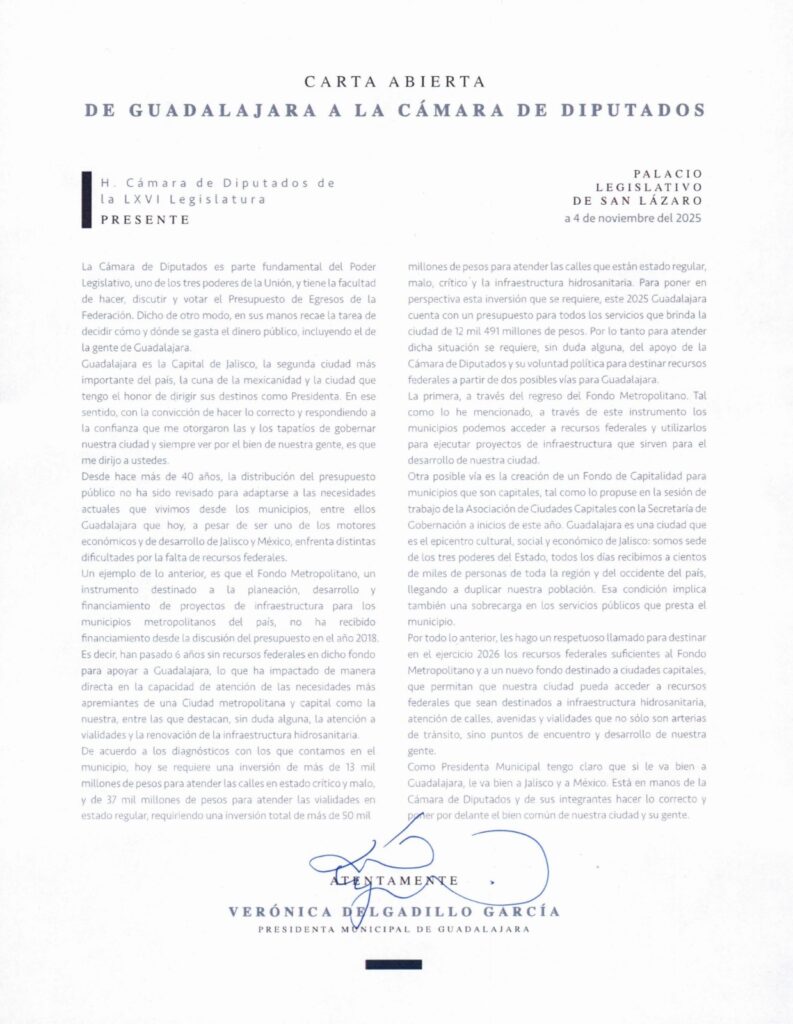 Delgadillo hizo un llamado para que el Presupuesto Federal 2026 contemple recursos que atiendan las necesidades del municipio de Guadalajara, especialmente en materia de infraestructura y vialidades.