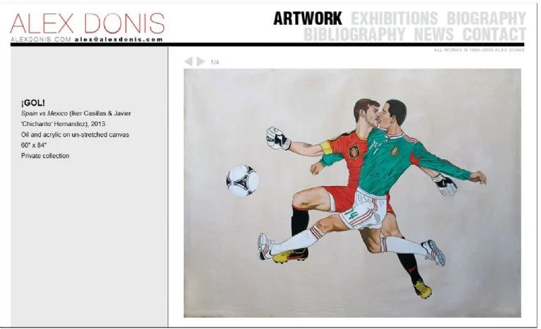 Una pintura controvertida que muestra a Javier “Chicharito” Hernández, con el uniforme de la Selección Mexicana, besándose con Iker Casillas, con el de España, incluyendo guantes de portero, forma parte de la serie “¡Gol!” creada por el artista visual estadounidense Alex Donis alrededor de 2013.