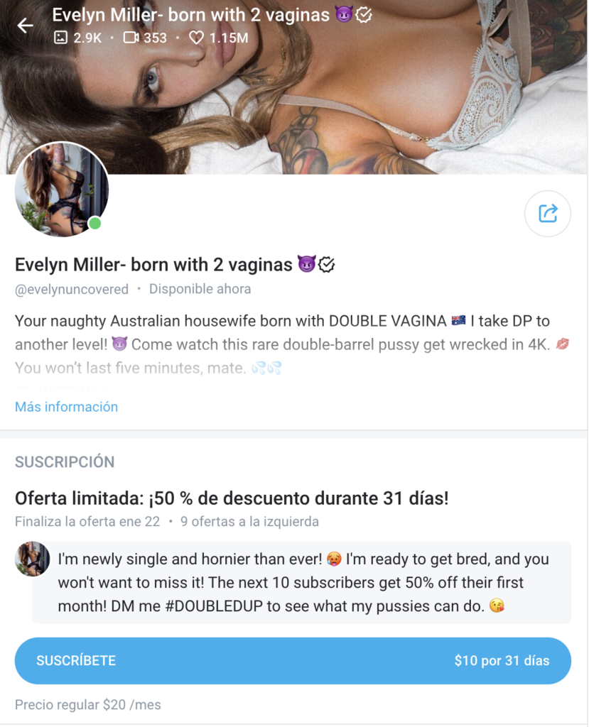 Evelyn Miller, es una creadora de contenido para adultos en OnlyFans de Australia con una condición médica muy poco común, nació con útero didelfo (uterus didelphys), lo que significa que tiene dos úteros completamente funcionales y dos vaginas.
