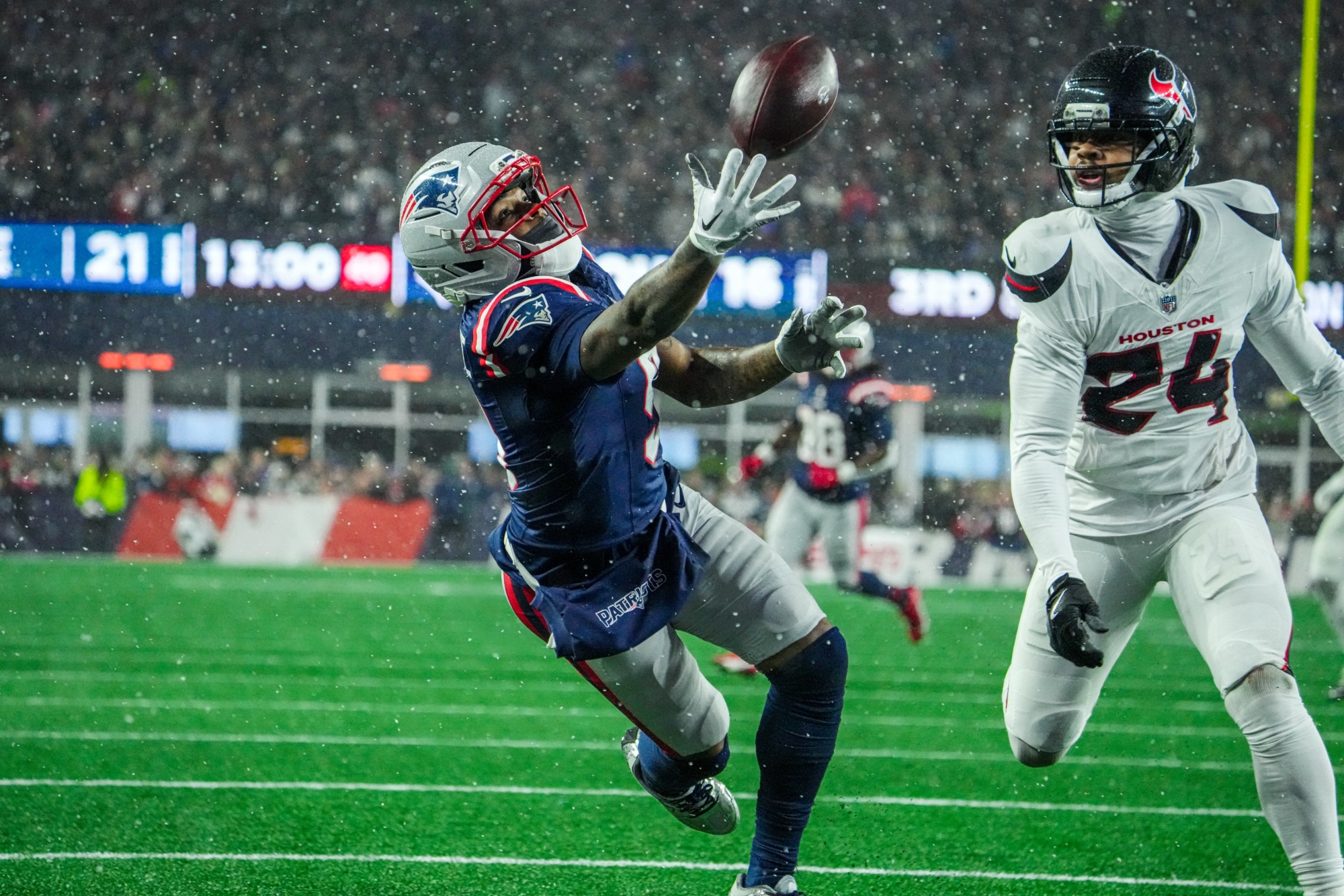 El mariscal de campo Drake Maye completó 16 de 26 pases para 179 yardas y tres envíos de anotación. La jugada que definió el partido llegó en el último cuarto, cuando Maye conectó un pase de 32 yardas con Kayshon Boutte para ampliar la ventaja. A pesar de cometer cuatro pérdidas de balón, New England mantuvo el control del marcador. En equipos especiales, el pateador venezolano Andrés Borregales convirtió tres puntos extra, mientras que el defensivo colombiano Christian González participó de manera constante en el esquema defensivo.