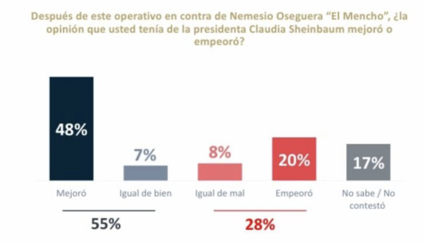 El impacto también se trasladó al terreno político. El 55% afirmó que su opinión sobre la presidenta Claudia Sheinbaum mejoró tras el operativo. Un 28% dijo que su percepción se mantiene igual de bien, mientras que solo un 7% señaló que empeoró.