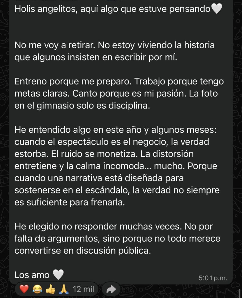 Algunos fans y medios lo tomaron como una señal de pausa o retiro temporal de la carrera. Sin embargo, la propia Ángela Aguilar salió rápidamente a desmentirlo. En un mensaje directo, aclaró: “No me voy a retirar. No estoy viviendo la historia que algunos insisten en escribir por mí. Entreno porque me preparo. Trabajo porque tengo metas claras. Canto porque es mi pasión. La foto en el gimnasio solo es disciplina.”