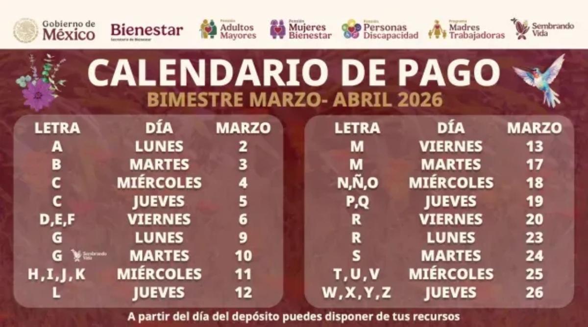 El calendario establece que los depósitos del bimestre marzo-abril se realizan entre el 2 y el 26 de marzo para todas las personas que cuentan con su tarjeta activa. El pago llega de manera automática a la cuenta del beneficiario en la fecha asignada según la letra inicial del primer apellido.