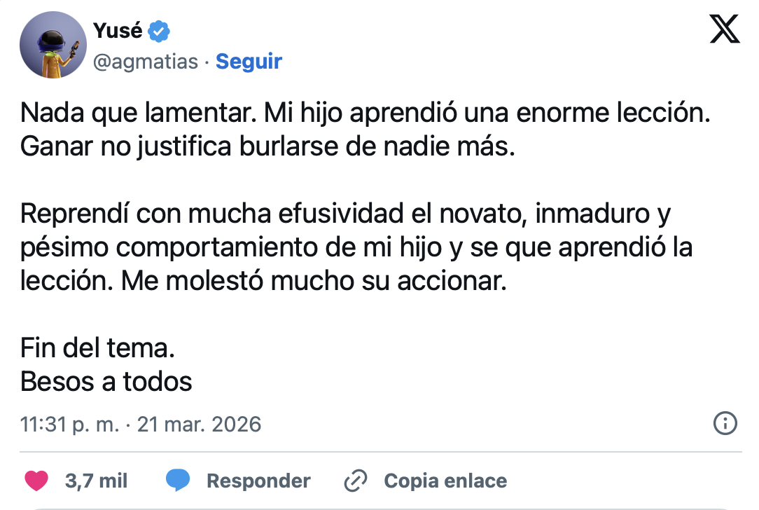 Tras la polémica, el implicado respondió en redes sociales asegurando que no agredió a nadie y que únicamente reprendió a su hijo por su conducta.