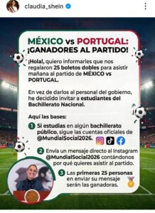 La Presidenta Claudia Sheinbaum anunció este viernes 27 de marzo que regalará boletos para el partido amistoso entre la Selección Mexicana y Portugal, que se jugará este sábado 28 de marzo de 2026 a las 19:00 horas en el Estadio Azteca, en su reapertura tras remodelación.