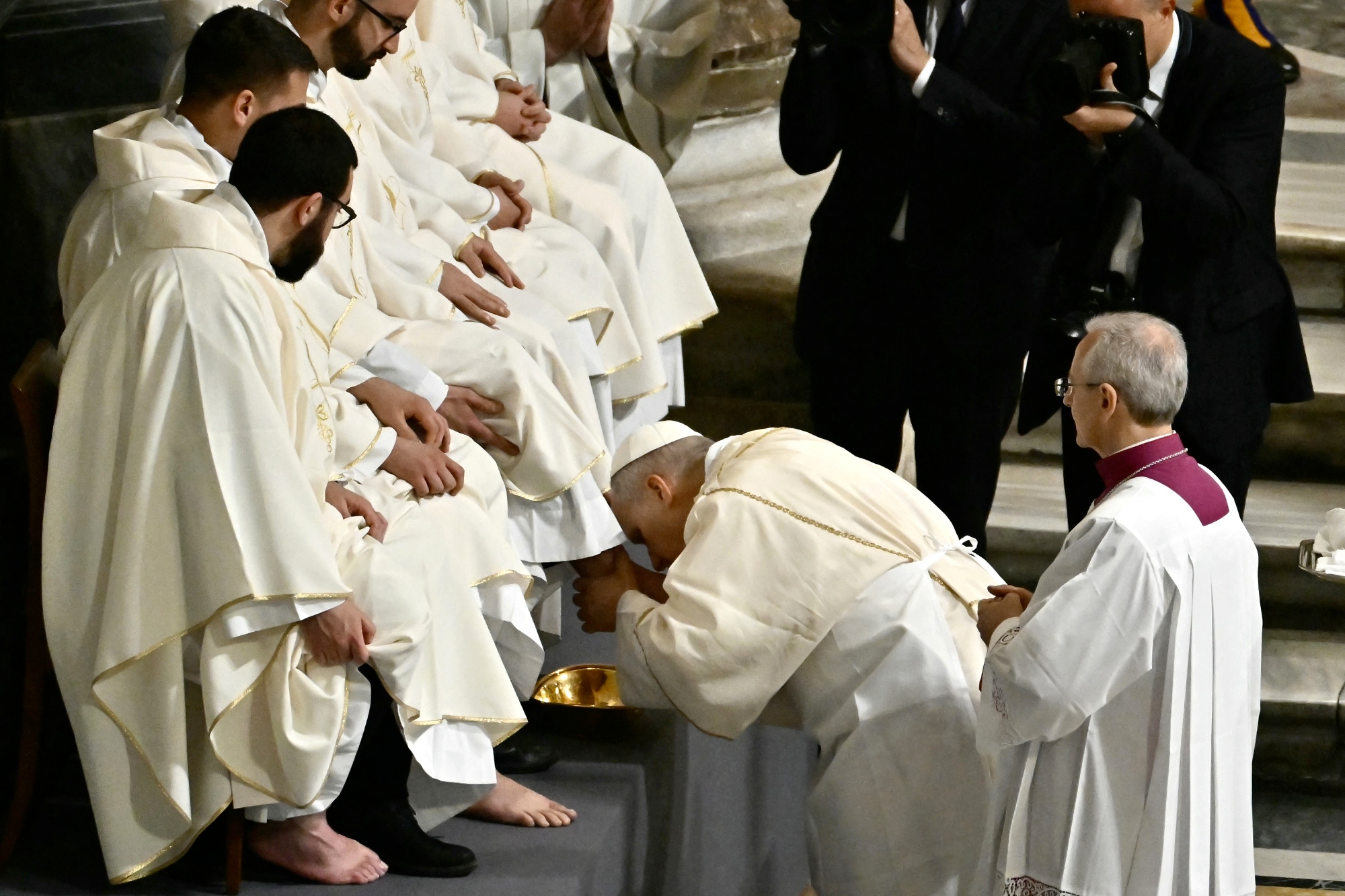 Las celebraciones del Triduo Pascual iniciaron con la misa crismal el Jueves Santo. El pontífice retomó el ritual del lavatorio de pies con sacerdotes, práctica distinta a la de Francisco, quien lo realizaba con grupos vulnerables.