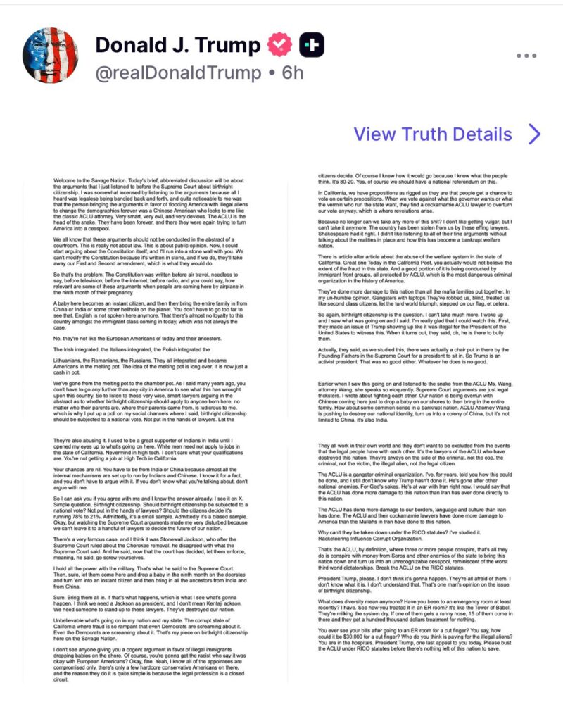 Trump publicó la noche del miércoles en redes sociales una diatriba aparentemente escrita por otra persona en la que criticaba el derecho constitucional estadounidense a la ciudadanía para todos los nacidos en el país.
