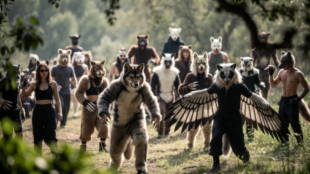 Caminan en cuatro patas, hacen sonidos o “vocalizaciones” de animales, como ladridos, maullidos, aullidos y más. Usan “gear”, máscaras de animales, colas, orejas, etc., hechas a mano o compradas